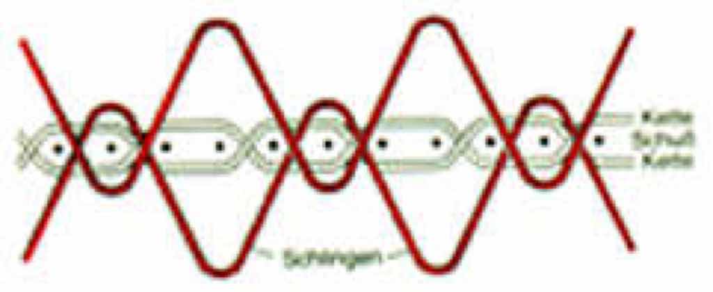Der Gewebeschnitt zeigt die Kette, den Schuss sowie die den Flor bildenden Schlingen (rot) für die linke und rechte Warenseite. Dekorationsstoffe.