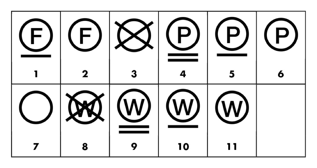 Der Textilreiniger muss bei der Wahl des Reinigungsverfahrens zusätzlich auch die Eigenart der Textilien und ihren Verschmutzungsgrad berücksichtigen (Normal-/Spezialreinigung). Es bedeuten: